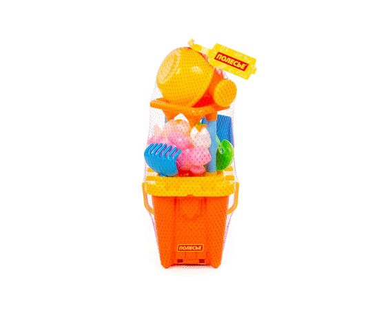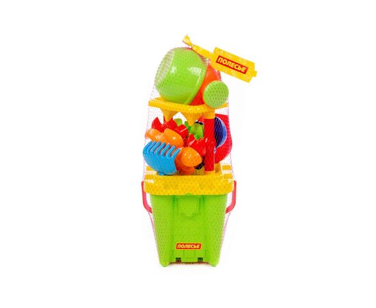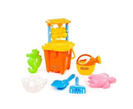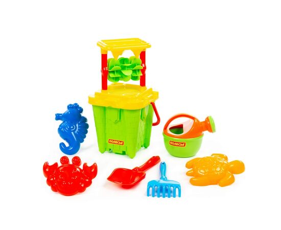 Песочная мельница №2 с основанием ситечко-крепость большое №2, ведро-замок большое №2, лопатка №5, грабельки №5, формочки (краб №2 + черепаха + морской конёк), лейка малая №4