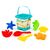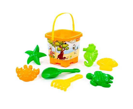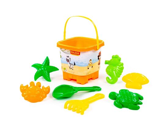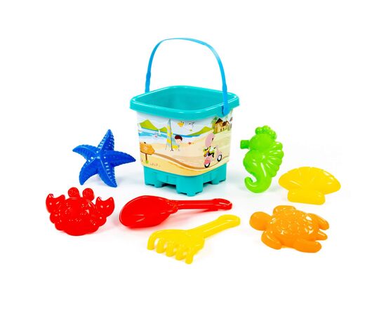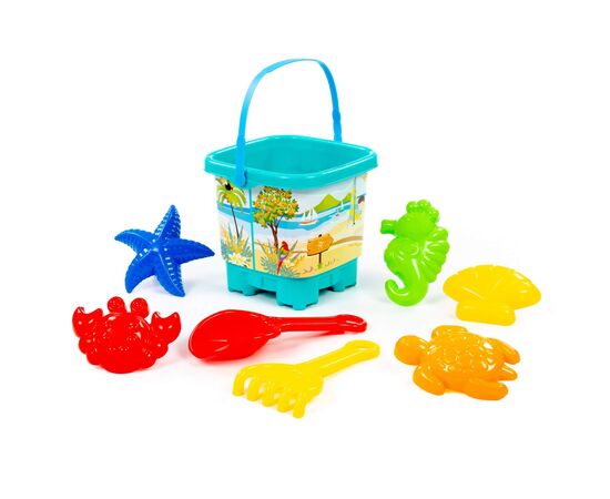Ведро-замок большое с наклейкой, совок №10, грабли №10, формочки (краб №2 + морская звезда №2 + ракушка №2 + морской конёк + черепаха)