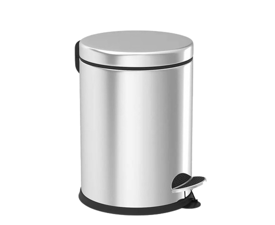 Ведро для мусора с педалью имеет одно отделение круглой формы со съемным внутренним ведром с ручкой. Основным материалом служит нержавеющая сталь, внутренняя емкость изготовлена из пластика. Оснащено педальной системой открывания крышки, позволяющей не прикасаться к емкости руками. Особый механизм обеспечивает плавное закрывание крышки, имеется отделка с защитой от следов.