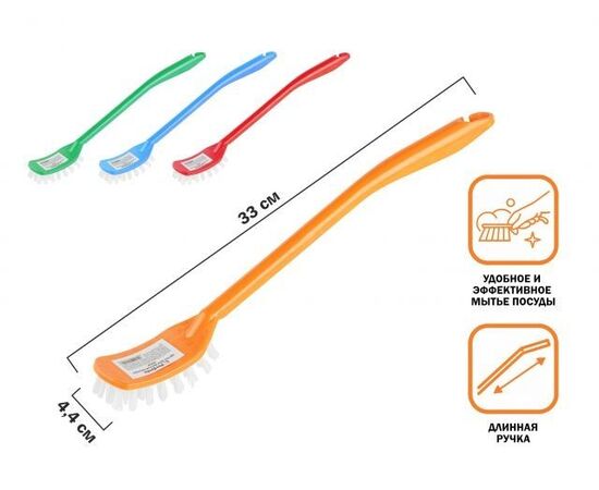 Щетка для мытья посуды представляет собой функциональный инструмент, созданный для удобного и эффективного мытья посуды. Ее размер составляет 33х4,4 см, и она изготовлена из прочного полипропилена. Щетка оснащена длинной ручкой, которая обеспечивает легкость доступа к труднодоступным местам.