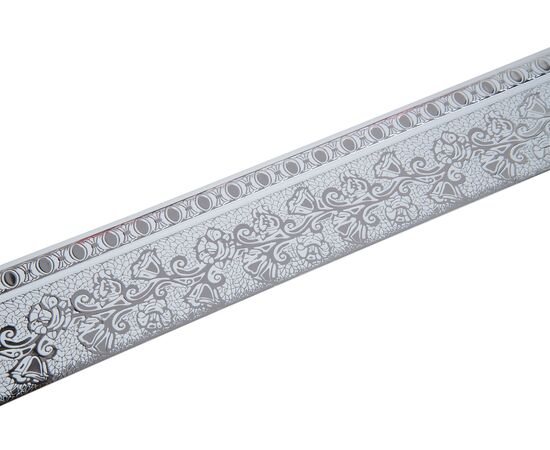 Экран-накладка с ажурным, кружевным, серебряным рисунком и белым фоном на пластиковый карниз. Сделана из ПВХ. Надевается на карниз и закрывает его.