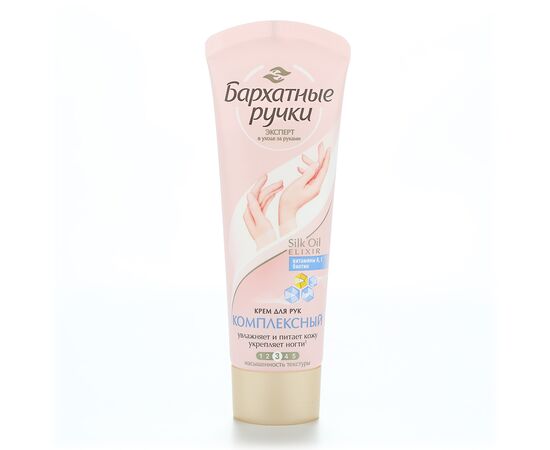 Бренд Бархатные Ручки представляет крем для рук Комплексный. Специальная формула крема обеспечивает необходимое питание и увлажнение кожи рук, способствует укреплению ногтей[1] и смягчению кутикулы. Действие крема усилено формулой Silk oil elixir. Микро-масла восстанавливают клетки кожи, и в комплексе с протеинами шелка делают ее мягкой и нежной. Состояние ногтей во многом зависит от правильного ухода за руками и кутикулой. Регулярное применение крема для рук, не менее 2-х раз в день, предотвращает появление сухости, сохраняя естественную красоту ногтей.