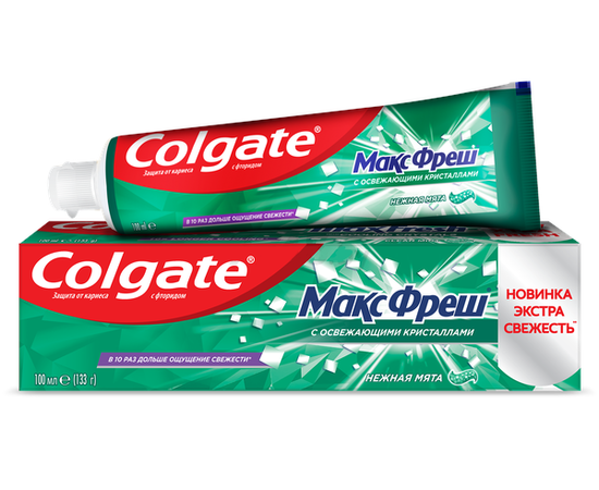 Зубная паста COLGATE Max Fresh Нежная мята 100 мл с освежающими кристаллами резко выделяется среди других зубных паст своей необычной формой и длительным действием. Зубная паста с текстурой прозрачного геля и кристаллами, растворяющимися при чистке зубов, позволяет добиться фантастического эффекта – свежее дыхание как минимум в течение трех часов!