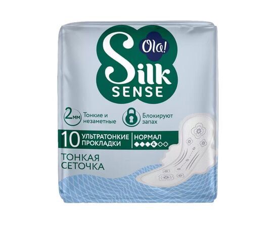 Прокладки женские гигиенические Ola! Silk Sense ультратонкие шелковая сеточка, 10 штук надежно защищают от протеканий и неприятного запаха в течение дня во время умеренных менструальных выделений. Тонкая сеточка на поверхности моментально поглощает влагу и препятствует прохождению ее обратно на поверхность. Внутренний суперабсорбент быстро превращает влагу в гель и удерживает ее внутри. Таким образом, поверхность прокладки остается сухой, даже если содержит большое количество жидкости. Ультратонке, незаметные и очень гибкие прокладки толщиной всего 2 мм. Широкие тройные крылышки надежно фиксируют ее к белью.