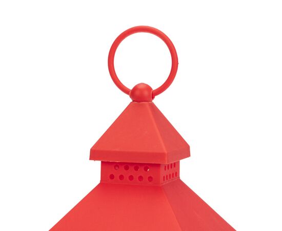 Декоративный элемент подсвечивается одним диодом, имитирующим теплое пламя свечи. Корпус красного цвета имеет высоту 24 см. Для размещения в подвешенном виде предусмотрено кольцо.