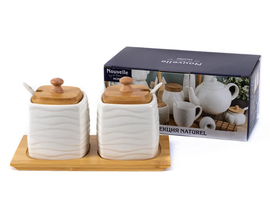 НАБОР БАНОК ДЛЯ СЫПУЧИХ ПРОДУКТОВ фарфор. 2 шт. 280 мл с ложками на деревянной подставке