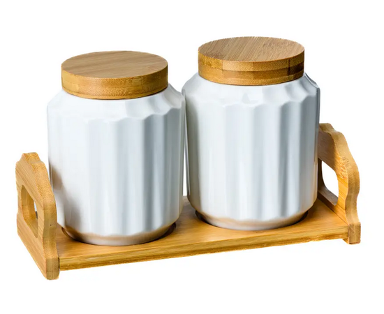 НАБОР БАНОК ДЛЯ СЫПУЧИХ ПРОДУКТОВ фарфор. 2 шт. 600 мл на бамбуковой подставке
