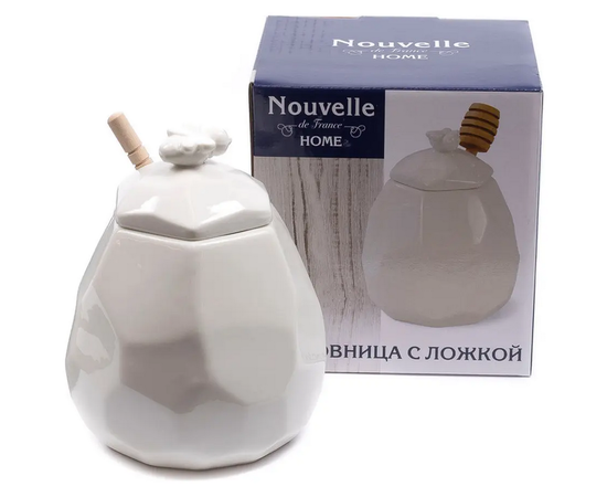 Банка для меда фарфоровая с крышкой и бамбуковой ложкой 0.45 л.