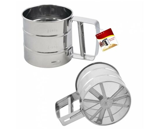 Сито-кружка для муки поможет быстро и качественно подготовить муку для замеса, выполнена в виде большой глубокой кружки, состоящей из корпуса с ситовым дном, двухсекционной ручки, внутри которой находится пружина из нержавеющей стали.