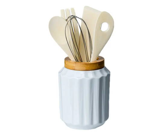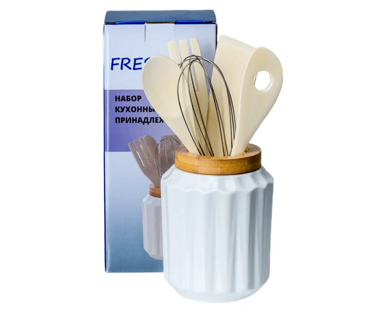 НАБОР КУХОННЫХ ПРИНАДЛЕЖНОСТЕЙ бамбук/металл 5 пр. в фарфоровой подставке: вилка, ложка, 2 лопатки,