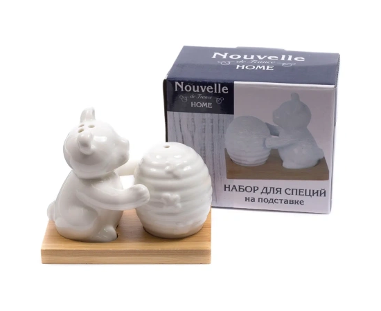 НАБОР ДЛЯ СПЕЦИЙ фарфоровый "Медведь/улей" 2 пр. на бамбуковой подставке: солонка, перечница (арт. 2