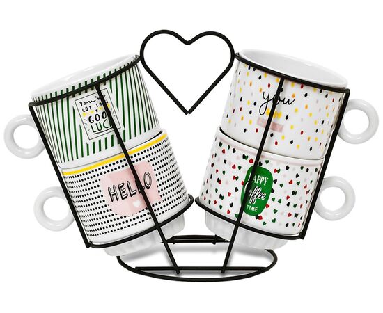Набор состоит из 4 чашек 260 мл и подставки. Чашки изготовлены из высококачественной керамики, подставка изготовлена из металла, она компактная и не занимает много места, поможет Вам сэкономить место на кухне. Набор подходит как для ежедневного использования, так и для праздничной сервировки стола. Стильные чашки с надписями украсят интерьер Вашей кухни и поднимут настроение. Набор станет прекрасным подарком для ваших друзей, близких, коллег. Набор чашек поставляется в подарочной коробке.
