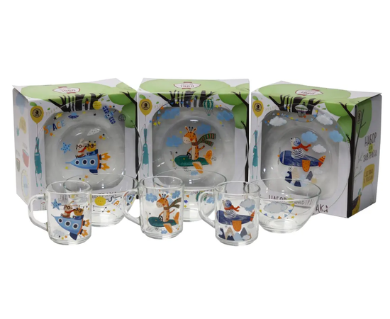 НАБОР ДЛЯ ЗАВТРАКА стеклянный детский "Авиаторы" 3 пр.: кружка, салатник, тарелка