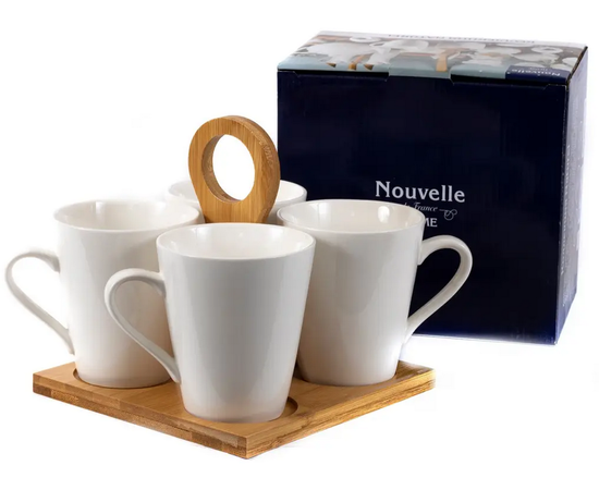 НАБОР КРУЖЕК фарфор. 4 шт. 250 мл/10 см на деревянной подст.