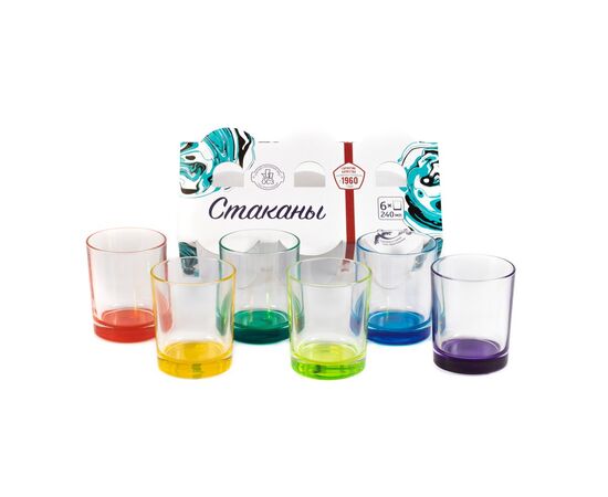 НАБОР СТАКАНОВ стеклянных "Гладкий" 6 шт. 240 мл с цветным дном