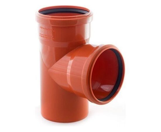 Тройник канализационный для трубы диаметром 160 мм. Имеет выход под трубу диаметром 110 мм под углом 87 градусов. Применяется при монтаже систем наружной канализации.