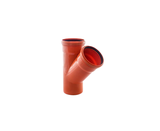 Тройник канализационный для трубы диаметром 110 мм. Имеет выход под трубу диаметром 110 мм под углом 45 градусов. Применяется при монтаже систем наружной канализации.